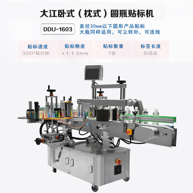 DDU-1603 立式圓瓶定位貼標(biāo)機(jī) 適用范圍:用途廣泛!主要適用于醫(yī)藥、日化、食品等行業(yè)的圓柱形包裝容器或小錐度的圓錐形包裝容器的單標(biāo)、雙標(biāo)自動(dòng)定位貼標(biāo).該機(jī)拓展性強(qiáng)!可選配各類打印機(jī)完成在線實(shí)時(shí)打印,可單機(jī)使用,亦能連接生產(chǎn)線使用 主要性能結(jié)構(gòu)特點(diǎn):1、中英文觸…